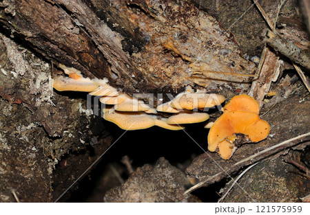 朽木の影に起毛でオレンジ色の美しいキヒラタケキノコ親子アップ(自然光+ストロボマクロ接写)