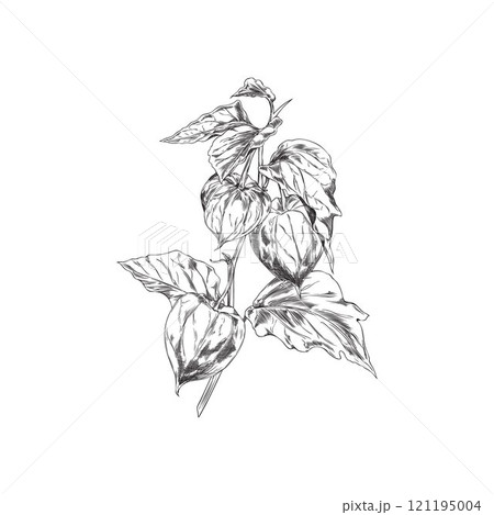 Physalis plant stalk engraved vector sketch, hand drawn nature botanical floral single ink design element, stem or twig