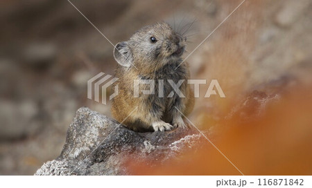 秋のガレ場で日向ぼっこするエゾナキウサギ