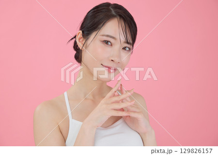 ピンク背景で撮影をした若い女性の爽やかな美容イメージ