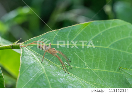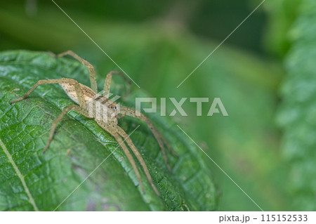 山間部の草の上で獲物を狙うスジアカハシリグモ