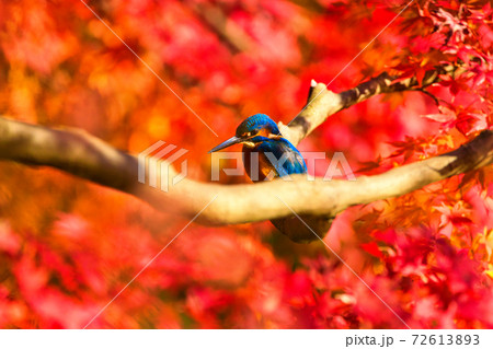 日本の秋の鮮やかな紅葉の朱に交わっても青く輝く美しいカワセミ