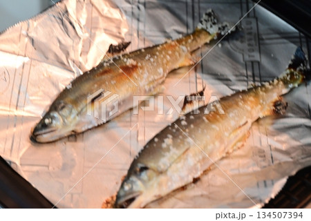 Fish with salt being grilled outdoors in Japan