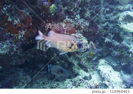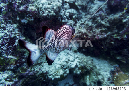 Blacktip soldier fish (Myripristis botche) in the coral reef of Maldives island. Tropical and coral sea wildelife. Beautiful underwater world. Underwater photography.