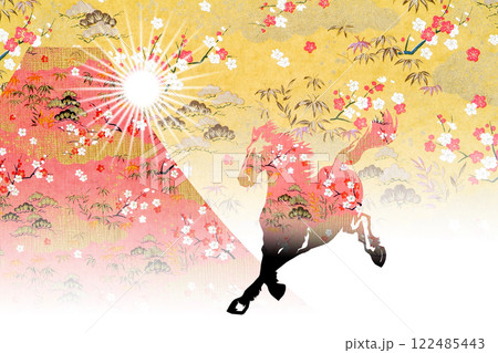 2026年 午年 富士山と馬の和風年賀状テンプレート