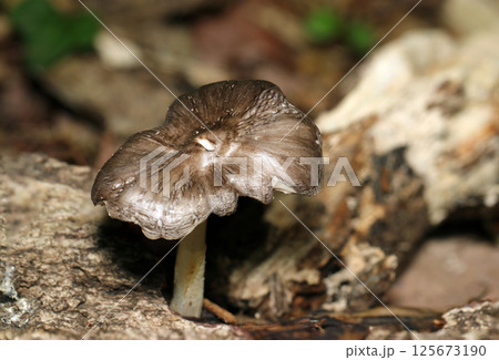 雑木林内の朽ち木横から薄灰茶色のウラベニガサ茸が成長(自然光+ストロボマクロ撮影)