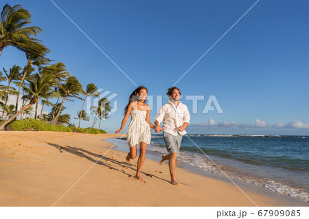Beach couple happy holding hands on hawaiian holidays in Waiohai beach, Poipu in Kauai, Hawaii, USA. Newlyweds people in love on honeymoon. Asian woman, Caucasian man
