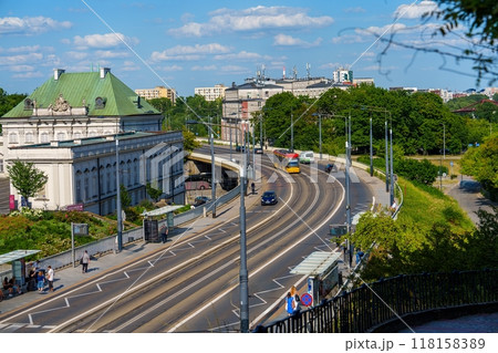 Cityscape of Warsaw with a tram passing by a historic building on a sunny day