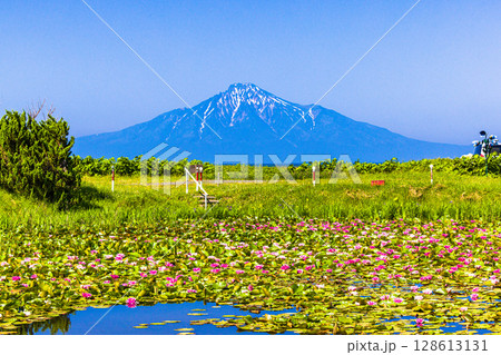 【北海道_オロロンライン】日本海に浮かぶ利尻富士を睡蓮池から眺望