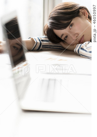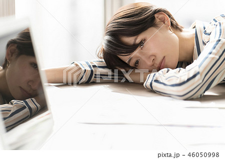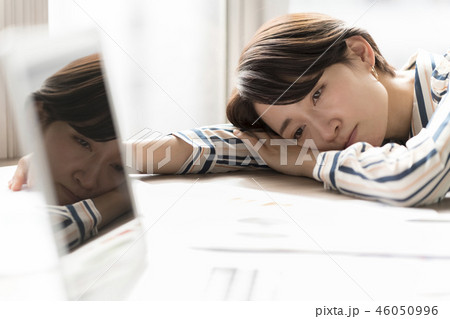 うつ病の女性キャリアウーマン倦怠感で机に横たわり居眠りブラック企業
