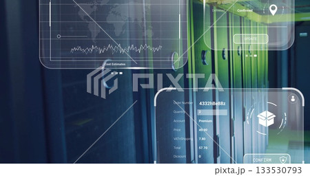 Displaying server racks with green lighting in data center, holographic cost and order panels