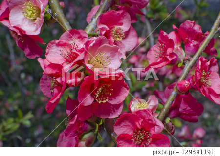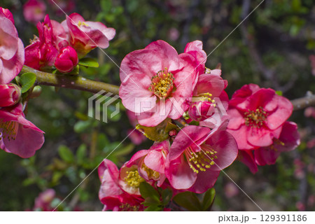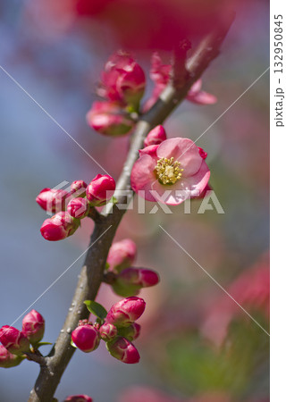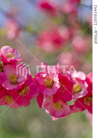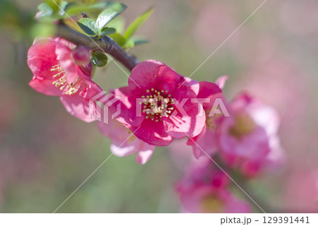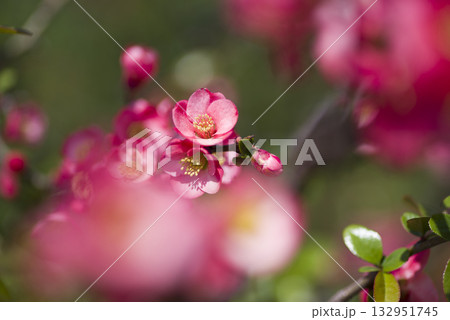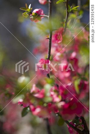 ピンク色のボケの花が満開です。