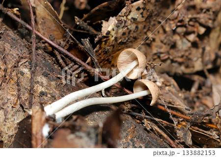 日本の落葉土壌に白い足の長いナヨタケ属キノコの幼菌(Psathyrell・マクロ撮影)