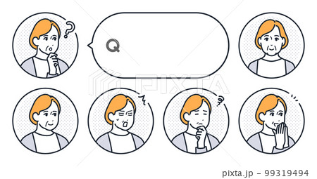 吹き出しセリフが似合うネガティブな表情の50代女性アイコンセット/横長/カジュアル/主線あり