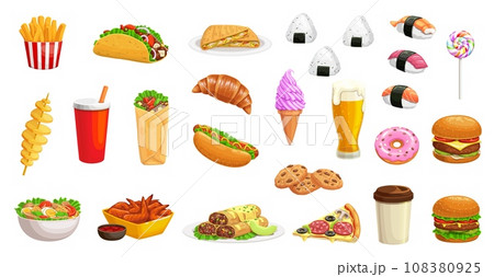 Cartoon fast food burger, drinks and pizza, hamburger and sandwiches, vector icons. Junk food or fastfood chicken and popcorn snack, soda or coffee, burrito and sushi with ice cream for fast food menu