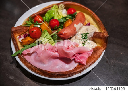 Dutch pancake with sausage, ham, vegetable, tomato, cheese on table