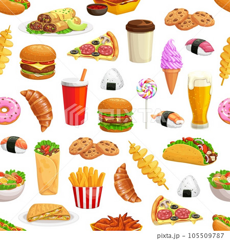 Cartoon fast food seamless pattern. Burgers and pizza, fastfood snacks and soda drinks vector background. Mexican taco, burrito and beer, hot dog, donut, fries and coffee, sushi and chicken wings