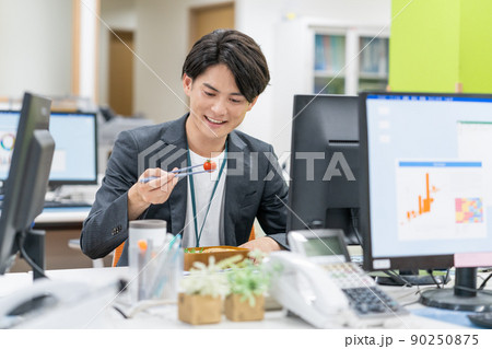 SDGs オフィスでマイ箸を使ってお弁当を食べるビジネスマン