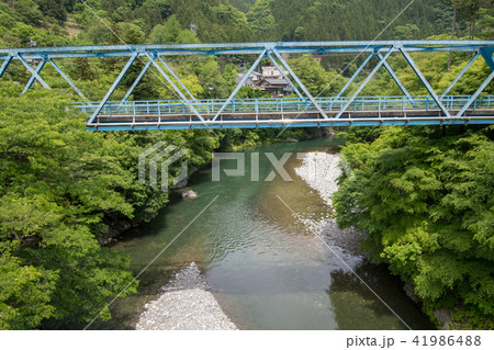 山梨県山梨市の西沢渓谷市営駐車場から笛吹川に架かる西沢大橋越しに鶏冠山を見る