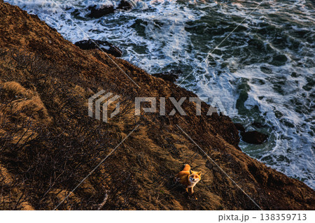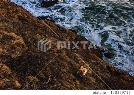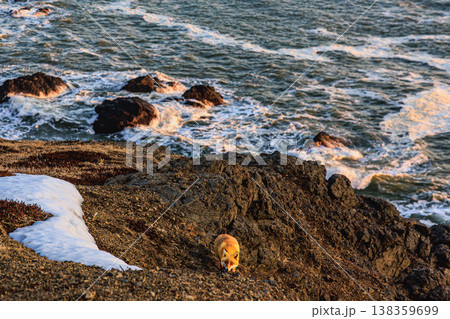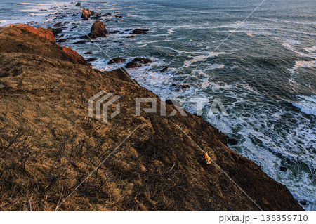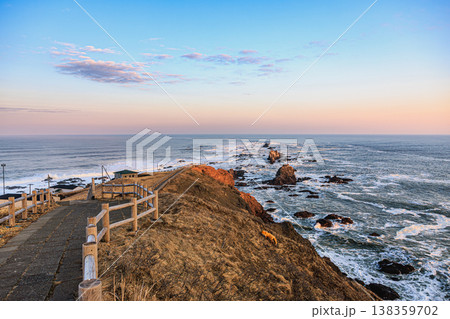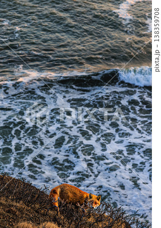 夕日に照らされる襟裳岬のキタキツネと海岸線