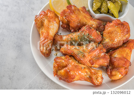 Savor the irresistible allure of these delicious, spicy buffalo chicken wings. Crispy, cooked to perfection and coated in a flavorful sauce, they are sprinkled with sesame seeds