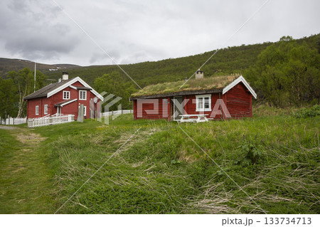 Red wooden houses in Kongsvoll, a scenic area of Dovrefjell Sunndalsfjella national park in Norway during a cloudy day