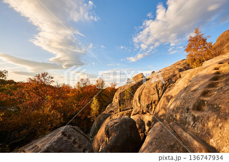 Golden hues of setting sun illuminate rocky formations and autumn foliage, casting warm glow on scene. Vibrant oranges and reds of trees below. Dovbush Rocks, Carpathian mountains, Ukraine, Europe.