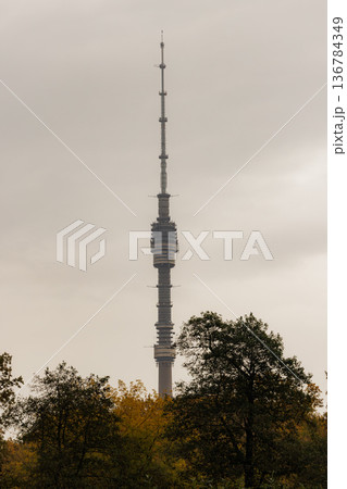Tall communication tower rises above the autumn trees in a cloudy sky