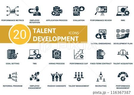 Talent Development icon set. Performance Metrics, Employee Retention, Application Process, Evulation, Performance Review, Rms, Digital Onboarding, Development Plan, Goal Setting, Tms icons and more