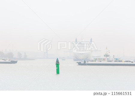 Big modern ferry ship navigate from Rostock harbor Warnemunde bay foggy spring autumn morning misty weather scenic view background. Maritime traffic liner passenger cargo vessel at Baltic sea Germany