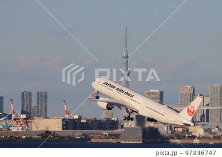 東京スカイツリーを背景に離陸する旅客機 羽田空港を離陸するJAL機