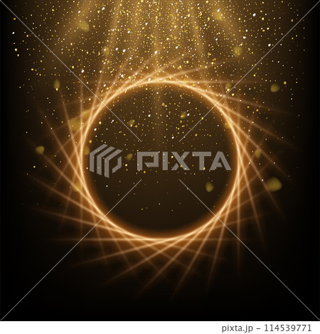 Golden circle with rays, glitter dust with shine and glow light effect vector illustration. Gold particles falling on magic round vortex, luxury rain of confetti with bokeh in festive wallpaper
