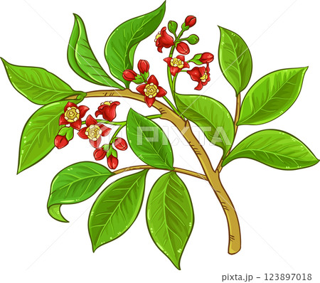 Sandalwood Branch with Berries and Leaves Colored Detailed Illustration.