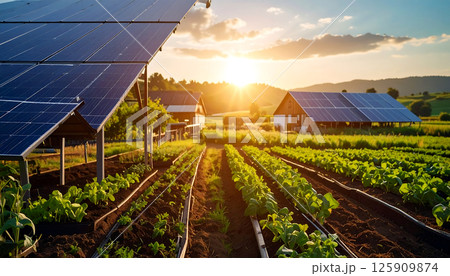 Solar panels in the foreground of an organic vegetable garden. Clean energy.