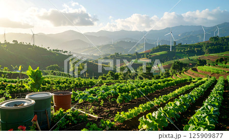 Sustainable vegetable garden with wind generators in the background of the landscape