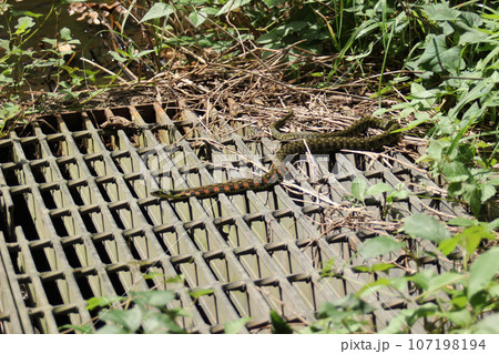 池の端にあるグレーチングの上に出てきた赤と黒色模様のヤマカガシ