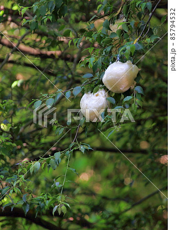 初夏、高原の池の上の木に産み付けられた、モリアオガエルの卵