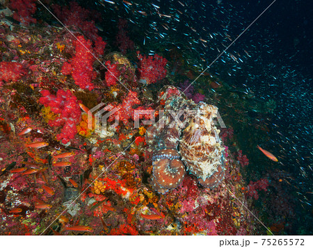 珊瑚礁に擬態するワモンダコ (リチェリューロック、スリン海洋国立公園、タイ王国)