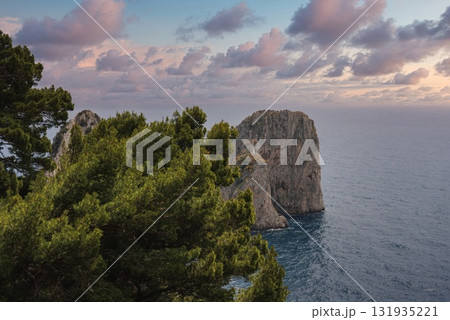 The island of Capri features a sea stack in the Tyrrhenian Sea, framed by green pine trees. The sunset sky displays pink and purple hues.
