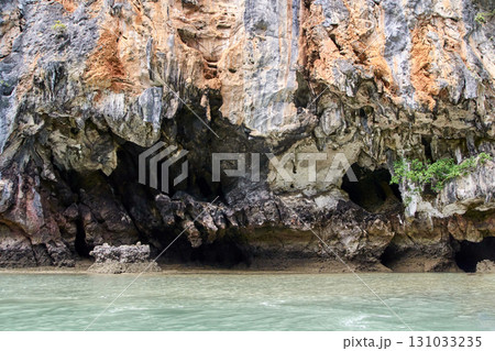 Limestone cliffs with natural caverns and green water at coastal location