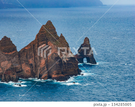 Jagged sea stacks and a natural arch rise from deep blue Atlantic at Ponta de Sao Lourenco, Madeira, Portugal. Overcast light, mist, and waves add a moody, raw feel.