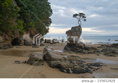 Iconic tree growing atop sea stack at Tinline Bay, Abel Tasman, NZ