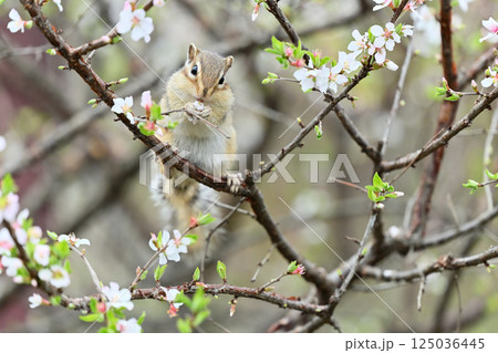 ユスラウメの花を食べるシマリス 春の素材