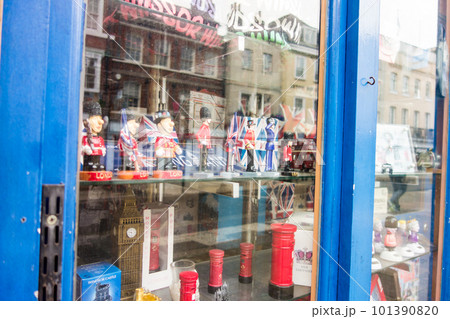 ウィンザーのお土産屋さんのショーウィンドウに飾られた衛兵と赤いポスト ウィンザーの街並み