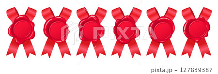 Red wax seals. Cartoon postal wax stamps with silk ribbons, antique paraffin seals flat vector illustration set. Vintage paraffin stamps