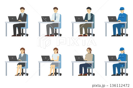 フラットイラスト:パソコンを使ってデスクで仕事する男女セット