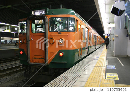 姫路駅付近を行く山陽本線113系(姫路発岡山方面行)