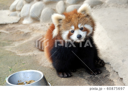 〔福井県・鯖江市西山動物園・3月]木の小屋からこちらに乗り出しているレッサーパンダ