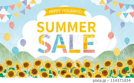 サマーセール ヒマワリ畑と海と空の背景イラスト