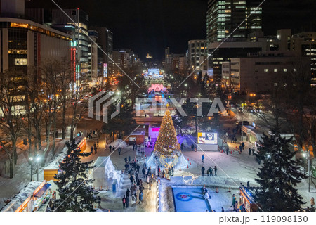 冬の北海道札幌市、さっぽろテレビ塔から見た雪まつり会場で賑わう大通公園の風景